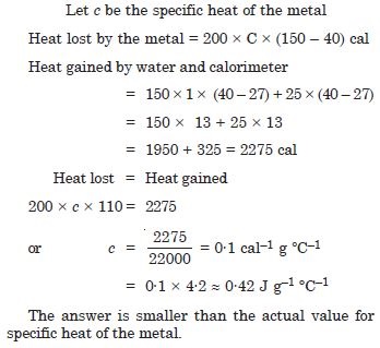 In an experiment on the specific heat of a metal, a 0·20 kg block of the metal at 150 C is dropped in a copper calorimeter (of water equivalent 0·025 kg) containing 150 cc of water at 27 C. The final temperature is 40 C. Compute the specific heat of the metal. If heat losses to the surroundings are not negligible, is your answer greater or smaller than the actual value for specific heat of the metal ?