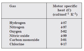 The gases are diatomic, and have other degrees of freedom (that is have other modes of motion) possible besides the translational degrees of freedom. To raise the temperature of the gas by a certain amount, heat is to be supplied to increase the average energy of all the modes. Consequently, molar specific heat of diatomic gases is more than that of monoatomic gases. It can be shown that if only rotational modes of motion are considered, the molar specific heat of diatomic gases is nearly 5/2. R which agrees with the observations for all the gases listed in the table except chlorine. The higher value of molar specific heat of chlorine indicates that besides rotational modes, vibrational modes are also present in chlorine at room temperature.
