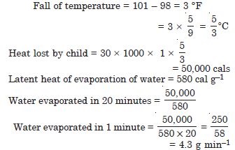 A child running a temperature of 101 F is given an antipyrin (i.e. a medicine that lowers fever) which causes an increase in the rate of evaporation of sweat from his body. If the fever is brought down to 98 F in 20 min., what is the average rate of extra evaporation caused by the drug ? Assume the evaporation mechanism to be the only way by which heat is lost. The mass of the child is 30 kg. The specific heat of human body is approximately the same as that of water, and latent heat of evaporation of water at that temperature is about 580 cal g–1.