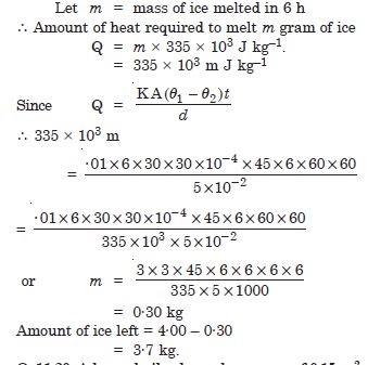 A thermocole box is a cheap and efficient method for storing small quantity of cooked food in summer in particular. A cubical box of side 30 cm has a thickness of 5 cm. If 4 kg of ice are put in a box. Estimate the amount of ice remaining after 6 h. The outside temperature 45 ºC, and coefficient K = 0·01 J s–1m–1 K–1 [Heat of fusion of water = 335 × 103 J kg–1].
