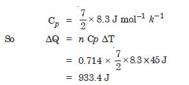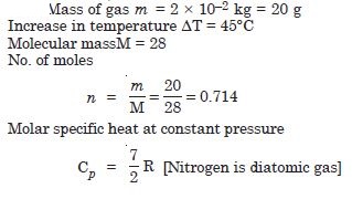 What amount of heat must be supplied to 2 × 10–2 kg of nitrogen (at room temperature) to raise its temperature by 45°, at constant pressure (Molecular mass of N2 = 2.8 R = 8·3 J. mol–1).