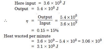 A steam engine delivers 5.4 × 108 J of work per minute and services 3.6 × 109 J of heat per minute from its boiler. What is the efficiency of the engine ? How much heat is wanted per minute ?