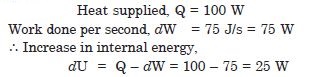 An electric heater supplies heat to a system at a rate of 100 W. If system performs work at a rate of 75 joule per second. At what rate is the internal energy increasing ?