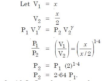 A cylinder with a movable piston contains 3 moles of hydrogen at standard temperature and pressure. The walls of the cylinder are made of a heat insulate and the piston is insulated by having a pile of sand on it. By what factor does pressure of gas increase if the gas is compressive to half its original volume ?
