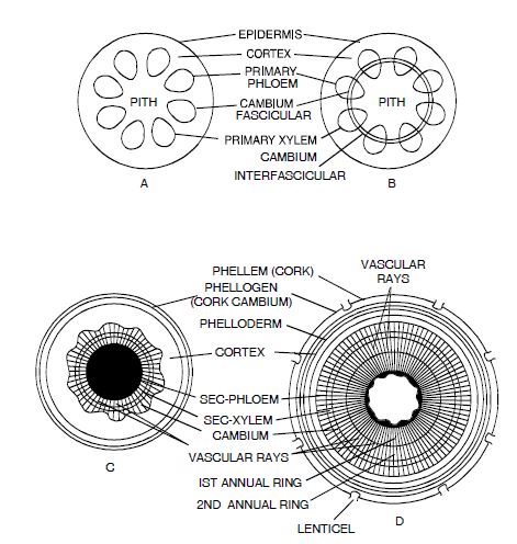Secondary growth. Secondary growth can be defined as an increase in diameter of the stem due to the activity of the lateral meristems i.e. vascular cambium and cork cambium (Figs. 6.3 and 6.4). The process of secondary growth in a dicot stem can be studied under headings given below :