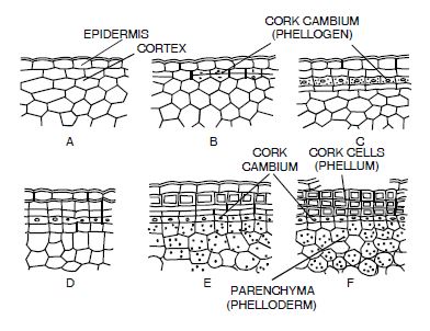 The cork cambium (phellogen) is a secondary lateral meristem which develops from permanent tissues in the region of epidermis, hypodermis, cortex or even in outer layers of phloem. It produces dead cells or cork (phellem) towards outer side and living cells of secondary cortex (phelloderm) towards inner side. These layers of cork, cork cambium and secondary cortex constitute the protective covering called periderm. The cork cells are highly lignified and check the loss of water from the general surface of stem. Sometimes the layers of cork are interrupted by lenticels.