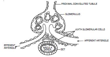 The kidneys have an inbuilt mechanism for the regulation of GFR by Juxta Glomerular Apparatus (JGA). At the point of contact of distal convoluted tubule and the afferent arteriole, are present swollen, dark coloured cells which have renin. Renin converts angioten-sinogen in blood to angiotensin I and further to angiotensin II which is a powerful vaso-constrictor. This increases glomerular blood pressure and thereby GFR.