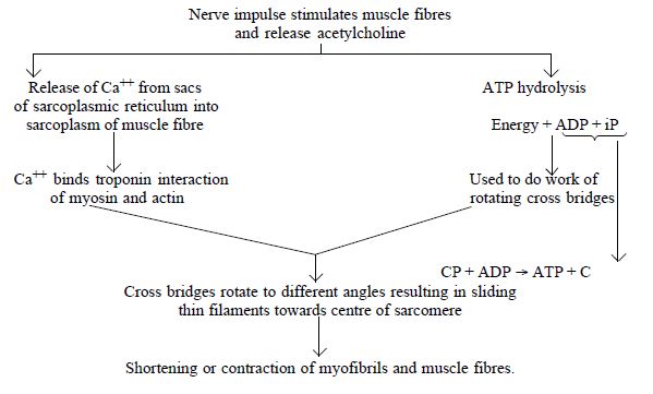 - The energised cross bridges move causing thin filaments to slide over the thick filaments thereby causing a decrease in the length of sarcomere.