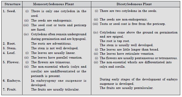 How would you distinguish monocots and dicots on the basis of three main characters ?
