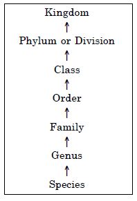 Taxonomic categories showing hierarchial arrangement in ascending order.
