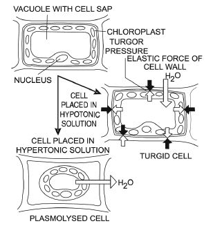 (b) If a plant cell is kept in a solution having higher water potential (hypotonic solution), water diffuses into the cell causing the cytoplasm to build up a pressure against the wall called the turgor pressure. The turgor pressure is ultimately responsible for enlargement and extensive growth of cells.