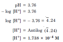 The pH of a sample of vinegar is 3.76. Calculate the concentration of hydrogen ion in it.