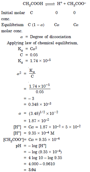 The ionization constant of acetic acid is 1.74 × 10–4. Calculate the degree of dissociation of acetic acid in its 0.05 M solution. Calculate the concentration of acetate ion in the solution and its pH.