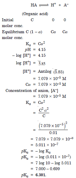 It has been found that the pH of a 0.01 M solution of an organic acid is 4.15. Calculate the concentration of the anion, the ionization constant of the acid and its pKa.