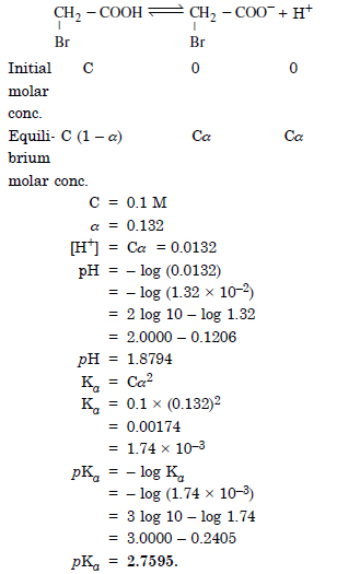 The degree of ionization of a 0.1 M bromoacetic acid solution is 0.132. Calculate the pH of the solution and the pKa of bromoacetic acid.