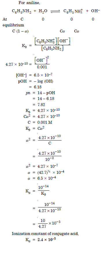 What is the pH of 0.001 M aniline solution ? The ionization constant of aniline can be taken as 4.27 × 10–10. Calculate the degree of ionization of aniline in the solution. Also calculate the ionization constant of the conjugate acid of aniline.