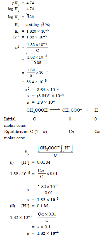 Calculate the degree of ionization of 0.05 M acetic acid if its pKa value is 4.74. How is the degree of dissociation affected when its solution also contains (a) 0.01 M (b) 0.1 M in HCl ?