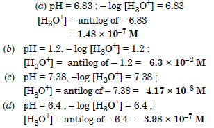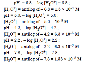The pH of milk, black coffee, tomato juice, lemon juice and egg white are 6.8, 5.0, 4.2, 2.2 and 7.8 respectively. Calculate corresponding hydrogen ion concentration in each.