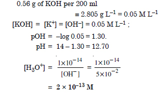 If 0.56 g KOH is dissolved in water to give 200 ml of solution at 298 K. Calculate the concentrations of potassium, hydrogen and hydroxyl ions. What is its pH ?