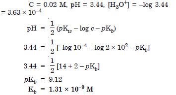 A 0.02 M solution of pyridinium hydrochloride has pH = 3.44. Calculate the ionization constant of pyridine.
