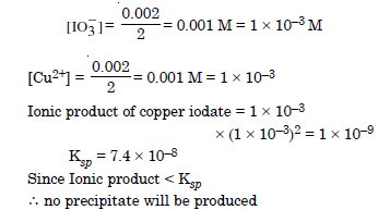 Equal volumes of 0.002 M solutions of sodium iodate and copper chlorate are mixed together. Will it lead to precipitation of copper iodate ? For copper iodate Ksp= 7.4 × 10–8.