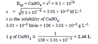 What is the minimum volume of water required to dissolve 1 g of calcium sulphate at 298 K ? (For calcium sulphate Ksp is 9.1 × 106)