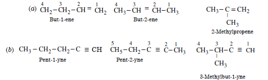 For the following compounds, write the structural formulae and IUPAC names for all possible isomers having number of double bond or triple bond as indicated. (a) C4H8 (one double bond) (b) C5H8 (one triple bond).