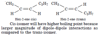 Draw cis and trans structures of hex-2-ene. Which isomer will have higher boiling point and why ?