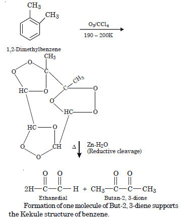 Write down the products of ozonolysis of 1, 2-dimethyl benzene. How does the result support Kekule’s structure of benzene?