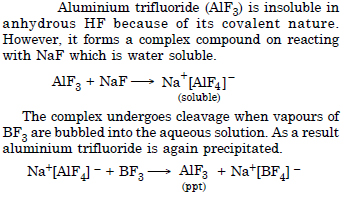 Aluminium trifluoride is insoluble in anhydrous HF but dissolves on addition of NaF. Aluminium trifluoride precipitates out of the resulting solution when gaseous BF3 is bubbled through. Give reasons.