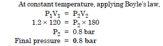 A vessel of 120 ml capacity contains a certain amount of gas at 35°C and 1.2 bar pressure. The gas is transferred to another vessel of volume 180 ml at 35°C. What would be its pressure ?
