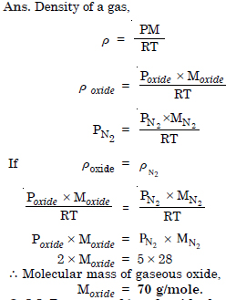 At 0°C, the density of a gaseous oxide at 2 bar is same as that of nitrogen at 5 bar. What is the molar mass of the oxide ?