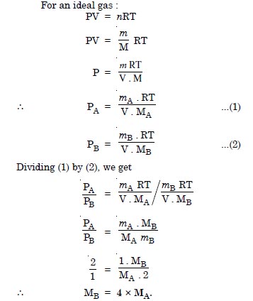 Pressure of 1 g of an ideal gas A at 27°C is found to be 2 bar. When 2 g of another ideal gas B is introduced in the same flask at same temperature, the pressure becomes 3 bar. Find a relationship between their molecular masses.