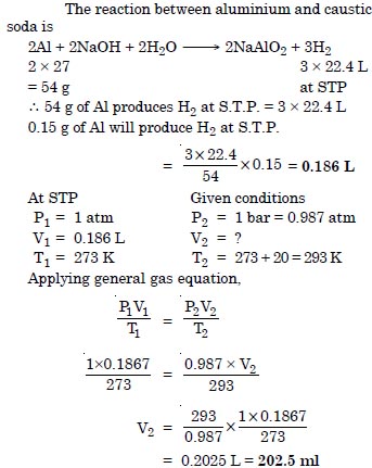 The drain cleaner Drainex contains small bits of aluminium which reacts with caustic soda to produce hydrogen. What volume of hydrogen at 20°C and one bar will be released when 0.15 g of aluminium reacts ?