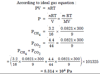 What will be the pressure exerted by a mixture of 3.2 g of methane and 4.4 g of carbon dioxide contained in a 9 dm3 flask at 27° C ?