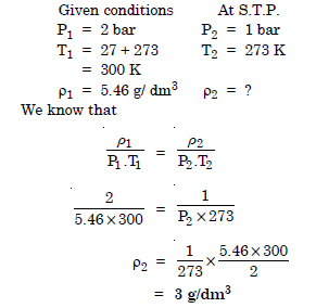 Density of a gas is found to be 5.46 g/dm3 at 27°C and 2 bar pressure. What will be its density at S.T.P. ?