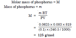 340.05 ml of phosphorus vapours weigh 0.0625 g at 546°C and 0.1 bar pressure. What is the molar mass of phosphorus ?