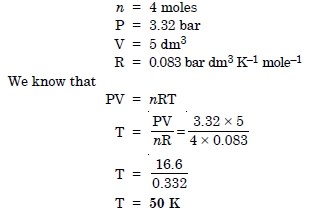 Calculate the temperature of 4.0 moles of a gas occupying 5 dm3 at 3.32 bar (R = 0.083 bar dm3 K–1 mol–1)