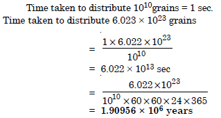 How much time would it take to distribute one Avogadro number of wheat grains, if 1010 grains are distributed each second ?