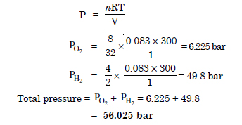 Calculate the total pressure in a mixture of 8 g of oxygen and 4 g hydrogen, confined in a vessel of 1 dm3 at 27°C. R = 0.083 bar dm3 k–1 mol–1