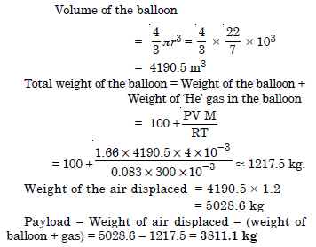 Pay load is defined as the difference between the mass of displaced air and the mass of balloon. Calculate the pay load when a balloon of radius 10 m, mass 100 kg is filled with helium at 1.66 bar at 27°C. (Density of air = 1.2 kg m–3 and R = 0.083 bar dm3 K–1 mol–1).
