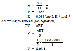 Calculate the volume occupied by 8.8 g of CO2 at 31.1°C and 1 bar pressure. R = 0.083 bar L K–1 mol–1