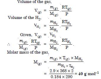 2.9 g of a gas at 95°C occupies the same volume as 0.184 g of hydrogen at 17°C at the same pressure. What is the molar mass of the gas ?