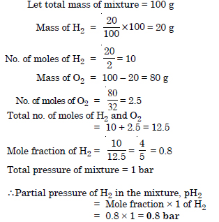A mixture of hydrogen and oxygen at one bar pressure contains 20% by weight of hydrogen. Calculate the partial pressure of hydrogen.