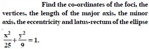 Find the co-ordinates of the foci, the vertices, the length of major axis, the minor axis. the eccentricity and the length of the latus-rectum of the ellipse :