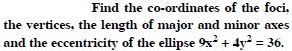 Find the co-ordinates of the foci, the vertices, the length of major axis, the minor