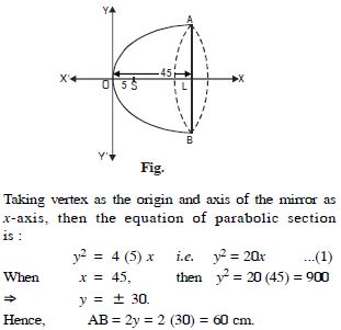 The focus of a parabolic mirror as shown in the figure is at a distance of 5 cm from its vertex. If the mirror is 45 cm deep, find the distance AB.