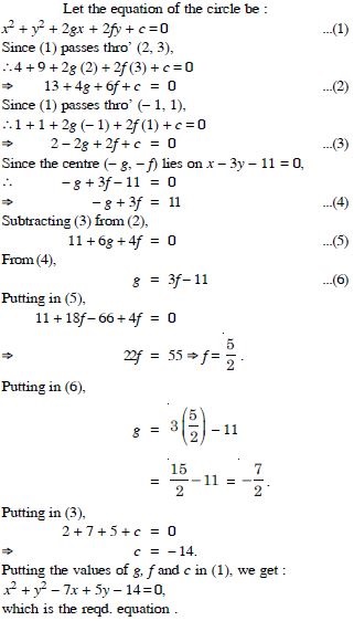 Find the equation of the circle passing through the points (2, 3) and (– 1, 1) and whose centre is on the line x – 3y – 11 = 0.
