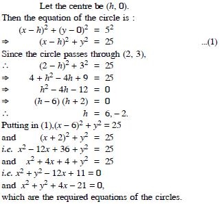 Find the equation of the circle of radius 5 whose centre lies on x-axis and passes through the point (2, 3).