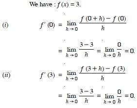Find the derivative of f (x) = 3 at x = 0 and x = 3.